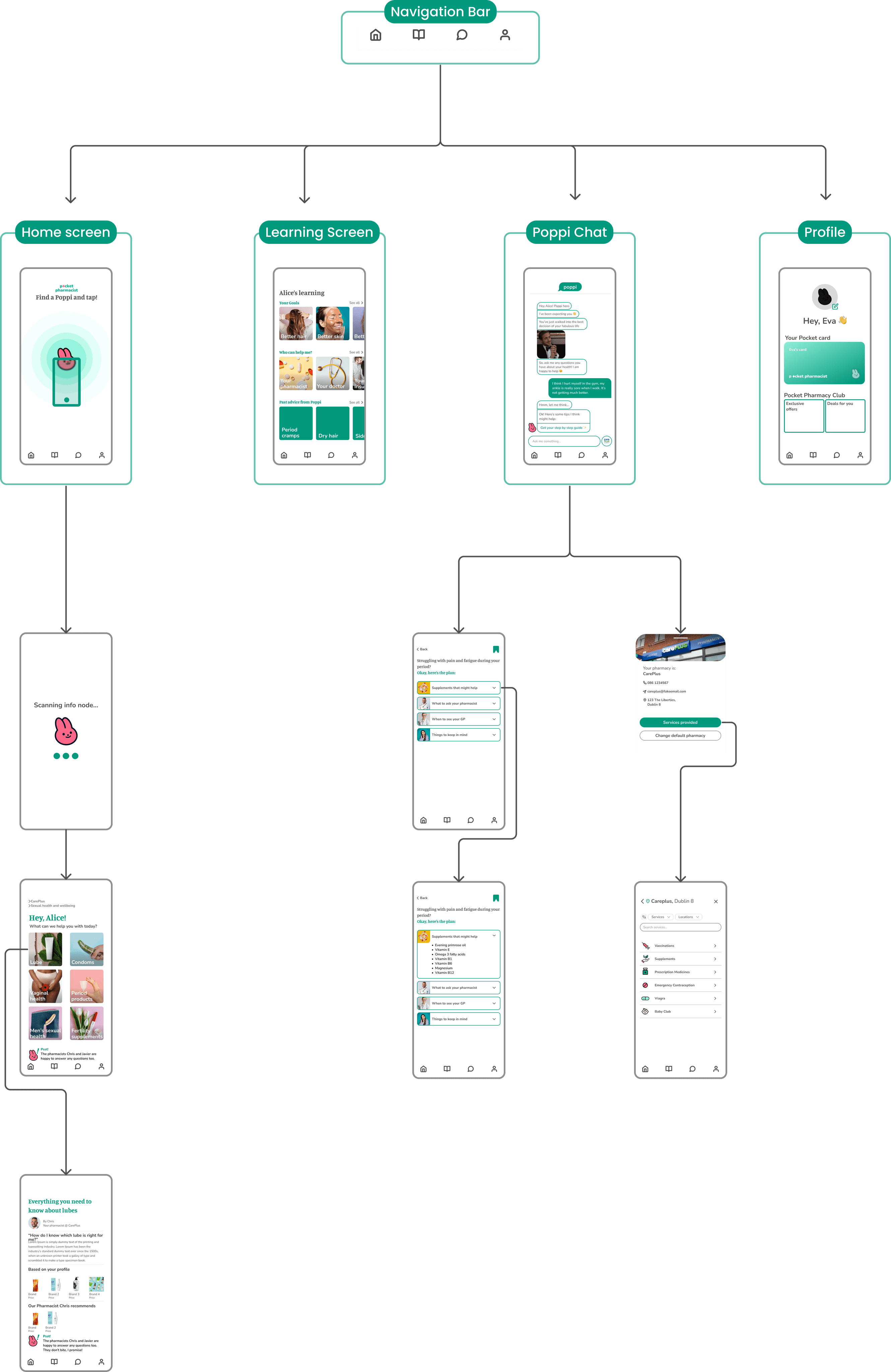Mapping out the user journey began with bringing awareness of our app to the user, we then followed the steps taken by the user from downloading to visiting and leaving the pharmacy in the physical world and what happens after that. This was to highlight the touchpoints in the user journey that we can intervene, ensuring our app is reaching the user in every way it needs to.