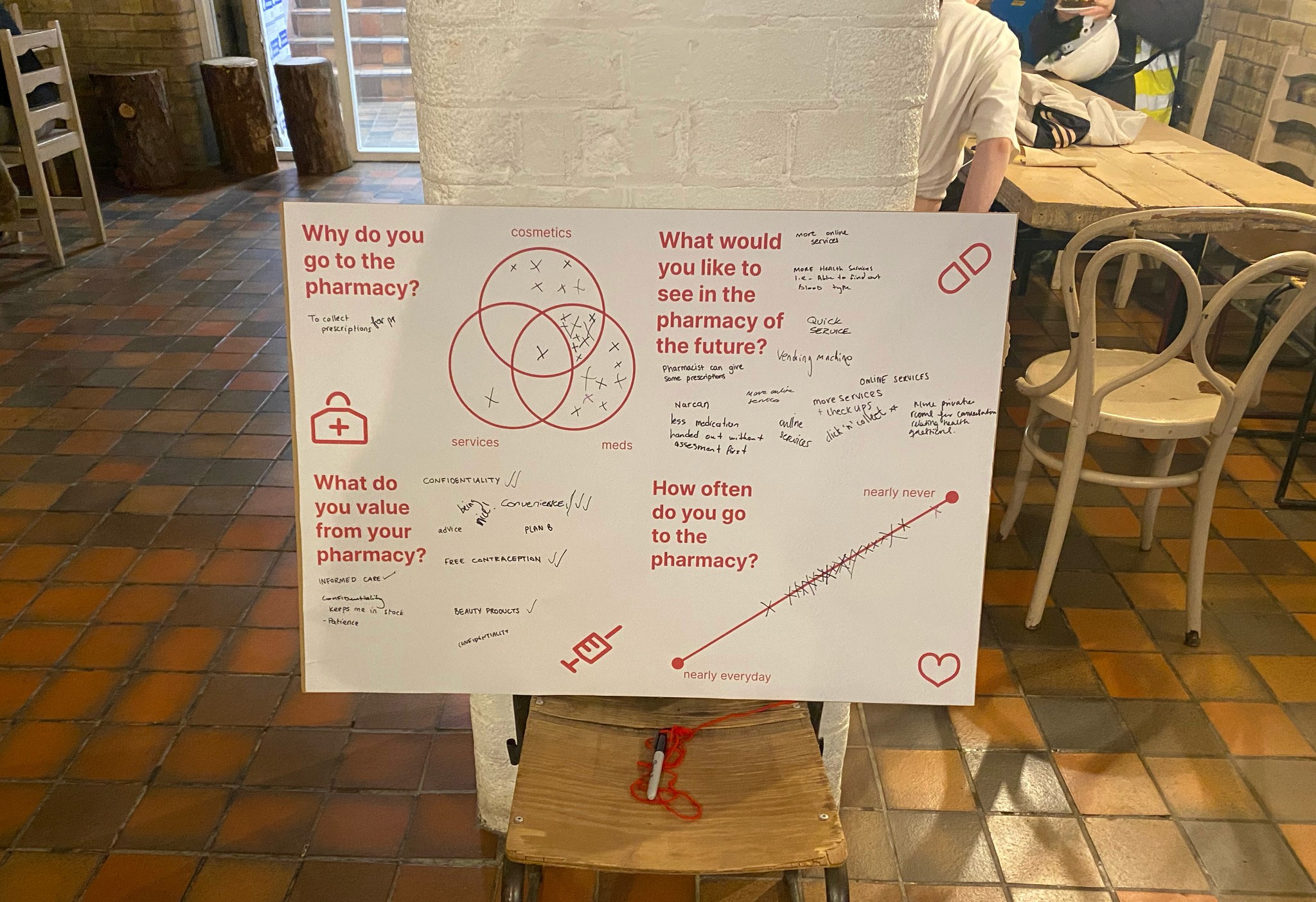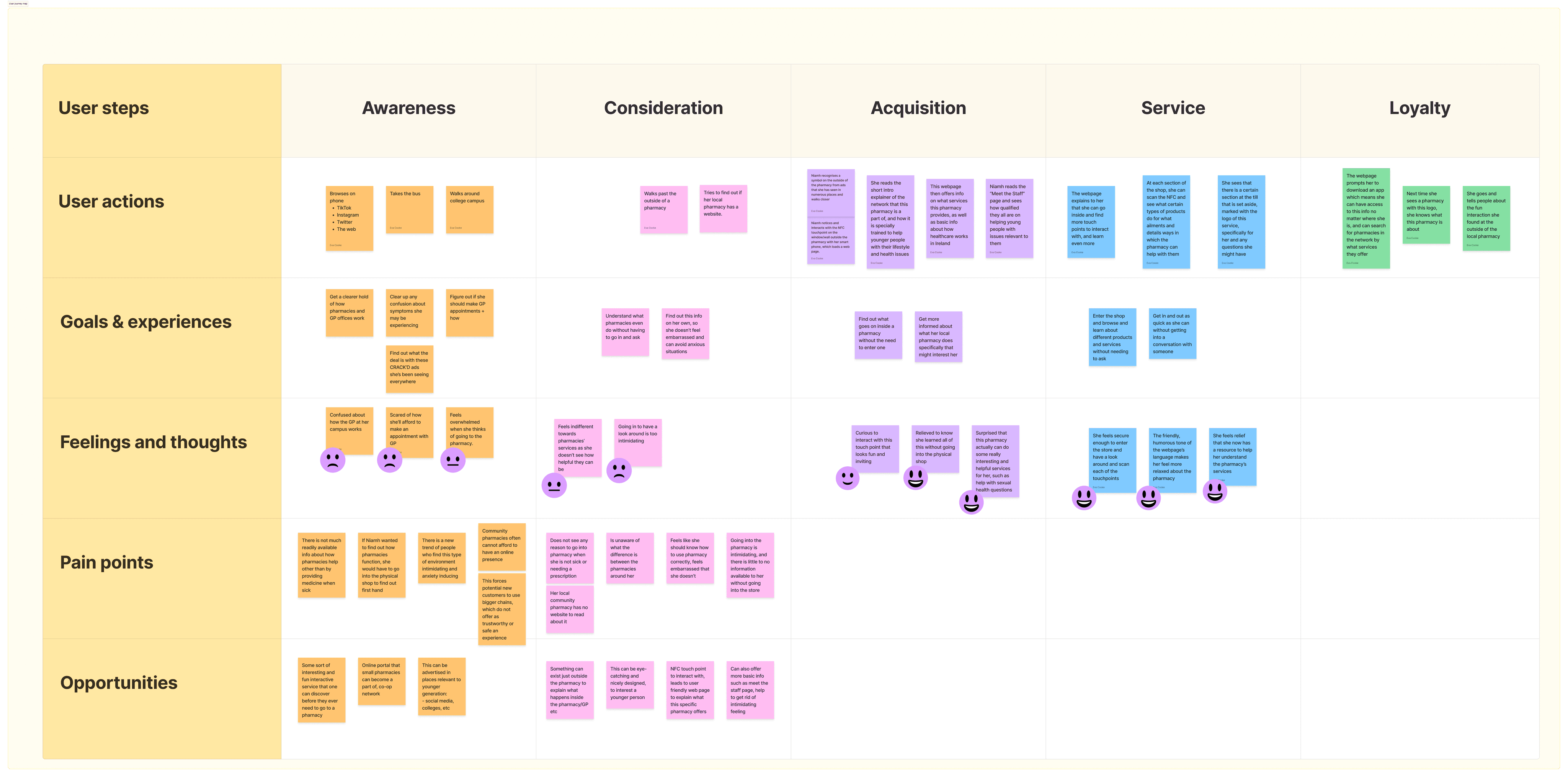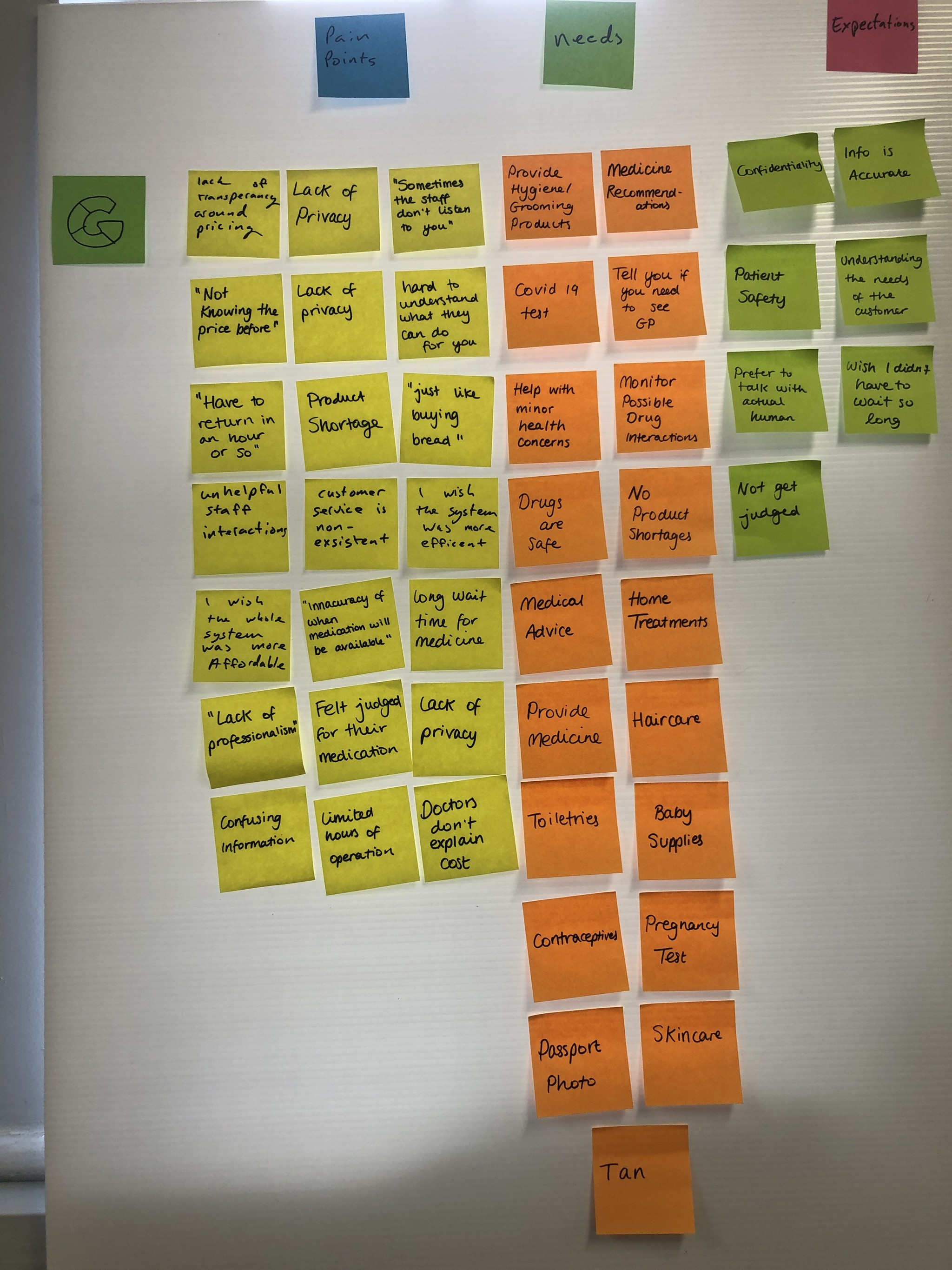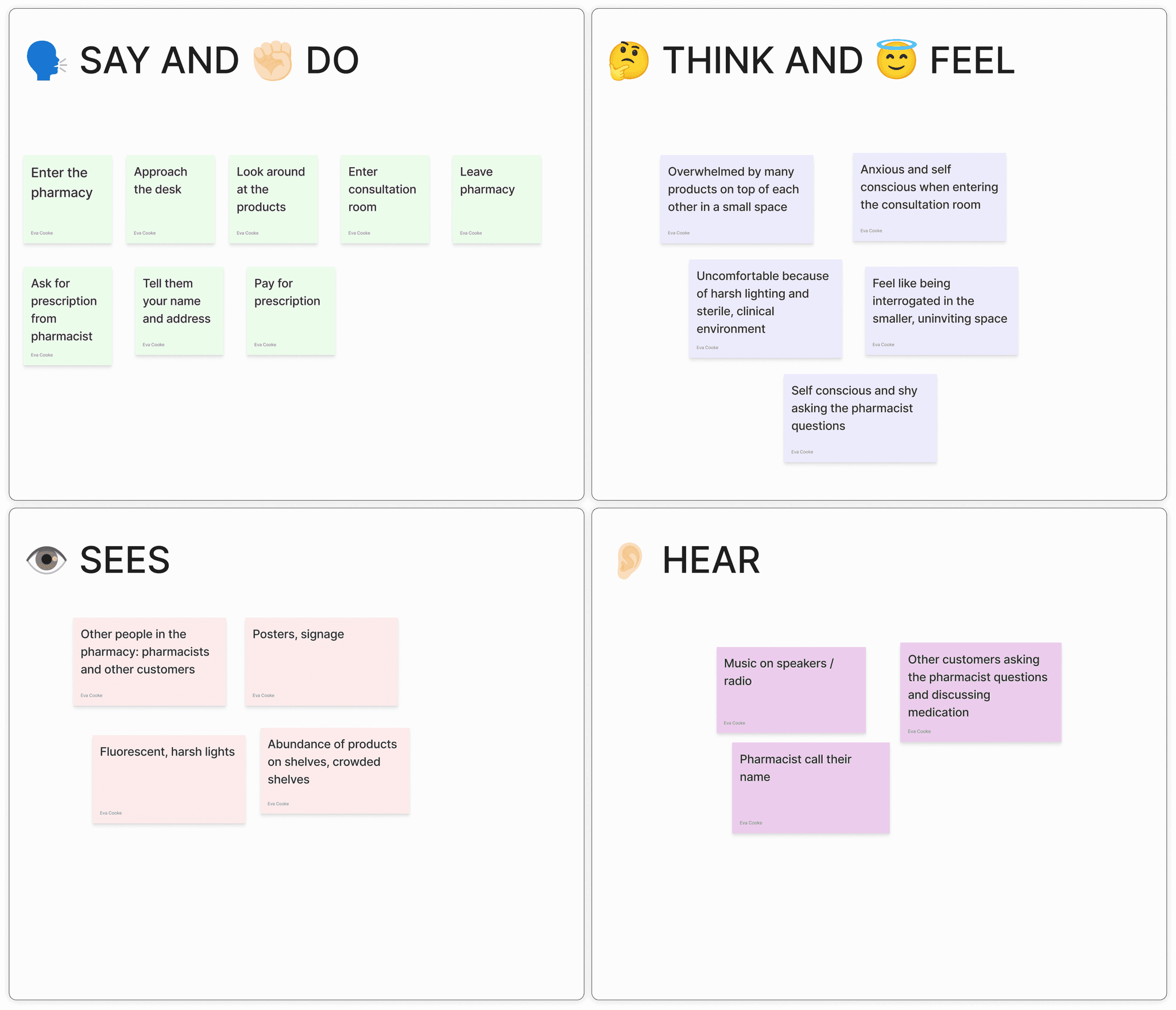 We created empathy maps based on the experience of actually visiting a pharmacy and getting a prescription. We took notes on how each stage of the journey felt, from finding the pharmacy and entering it, to leaving after chatting with staff.
