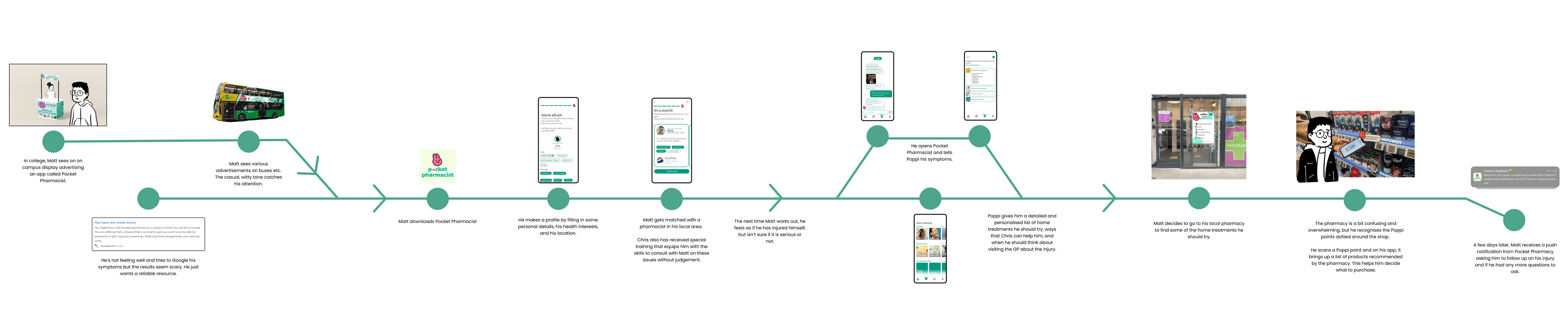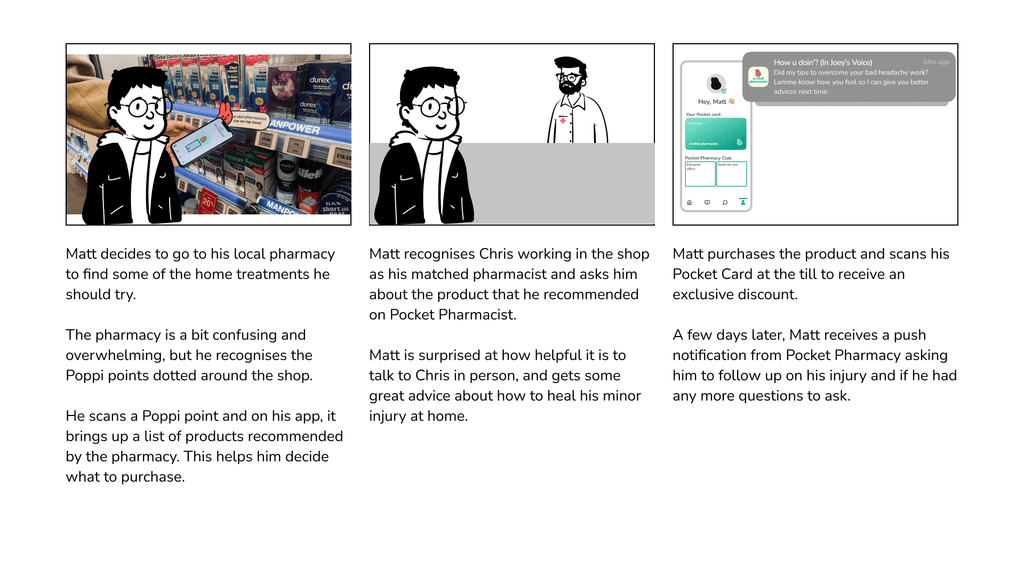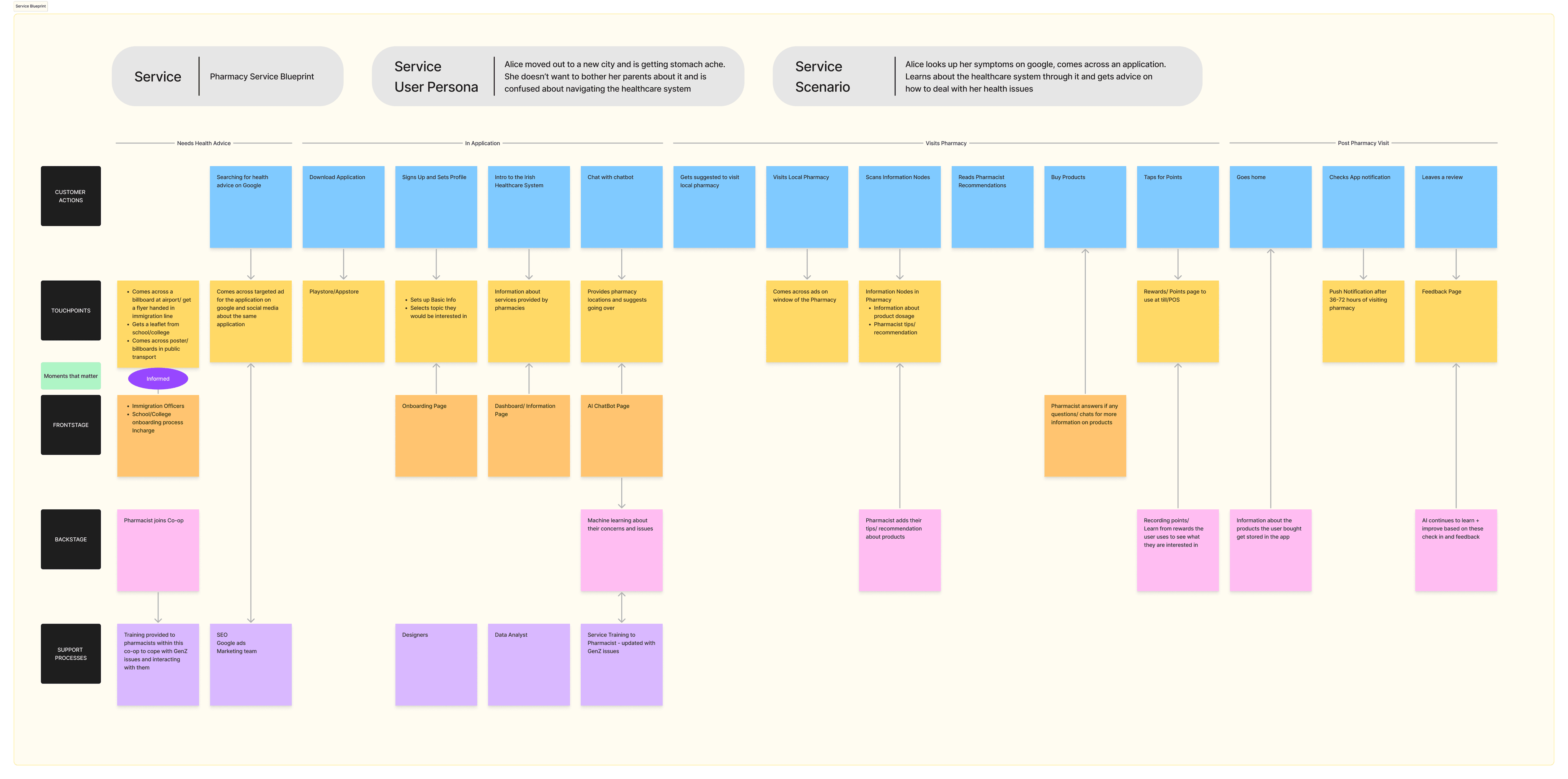 As the Pocket Pharmacist product goes beyond a digital app, developing the service blueprint was useful in identifying the complete, end-to-end service. It;s important to highlight how Pocket Pharmacist also works in the background for pharmacists and their business, as well as for the customer.
