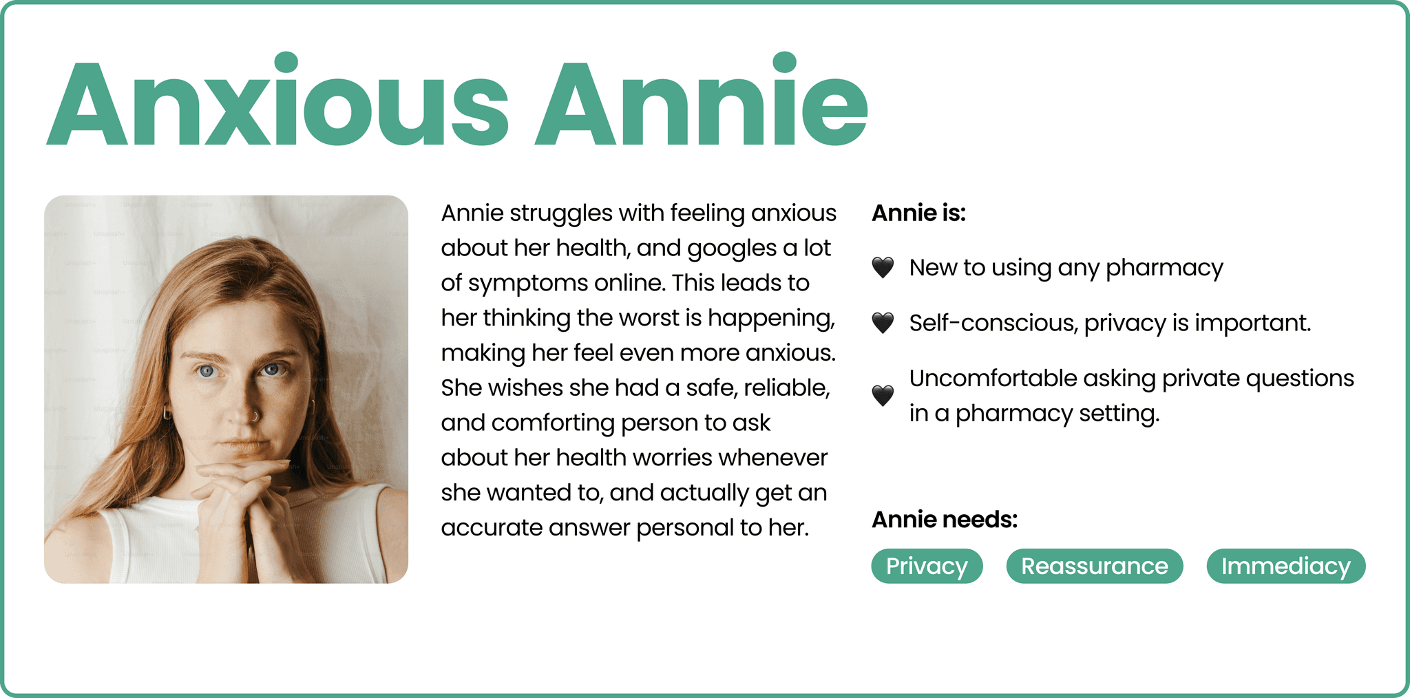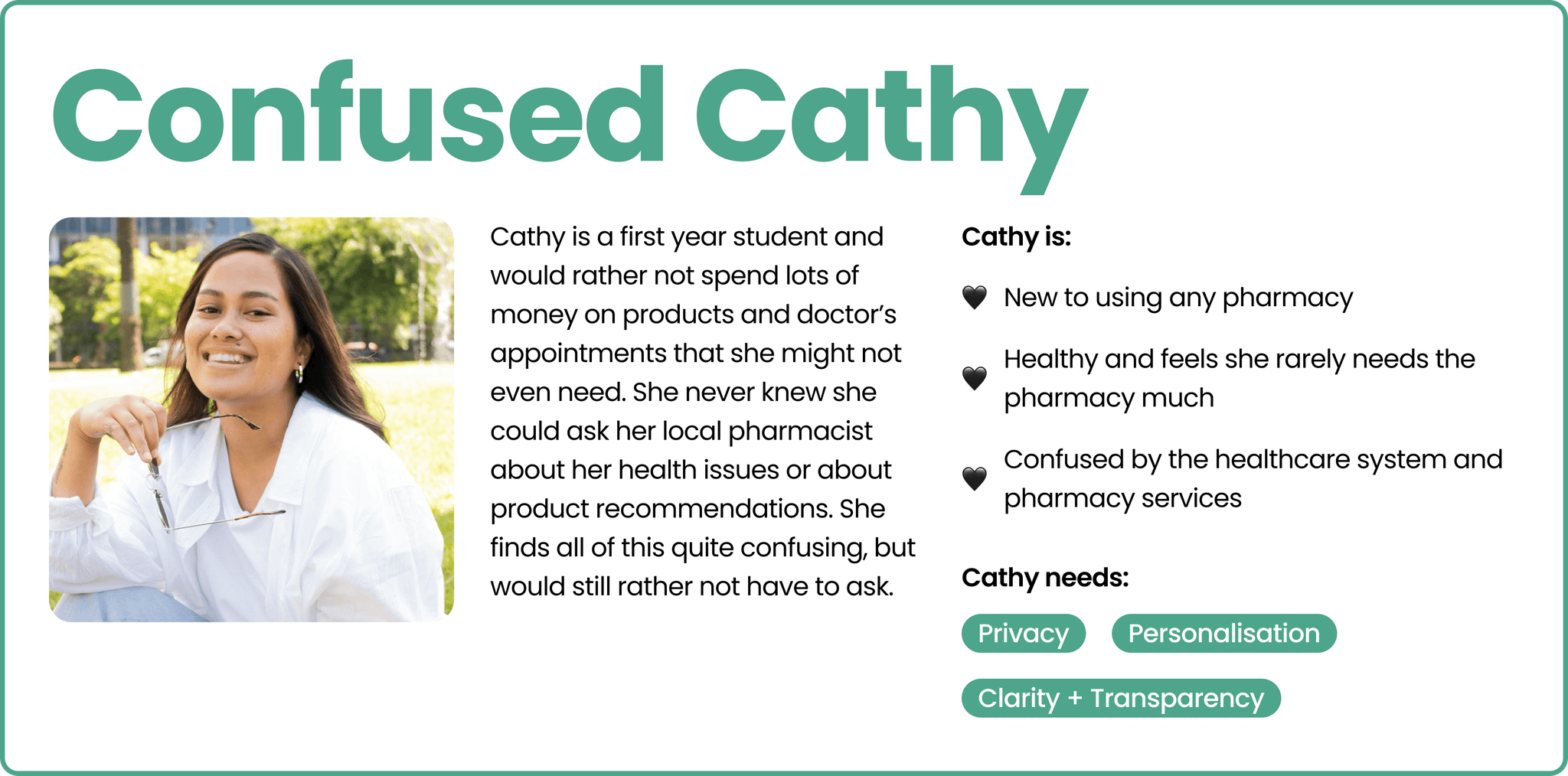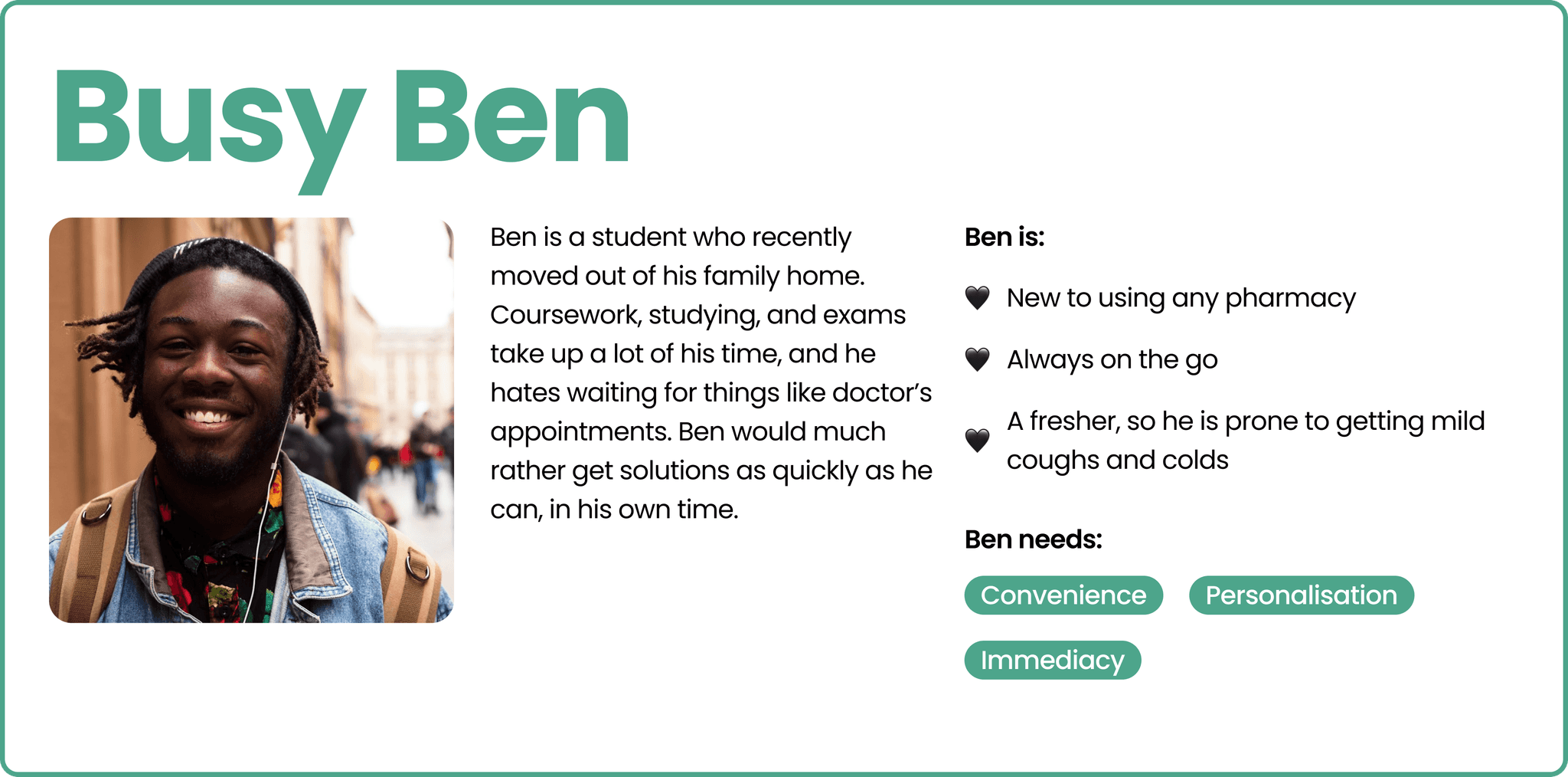 Based on the research done so far, we developed the below user archetypes to highlight and identify young pharmacy users' most pertinent needs. This enabled us to concpetualise solutions to the various pain points and user goals.
