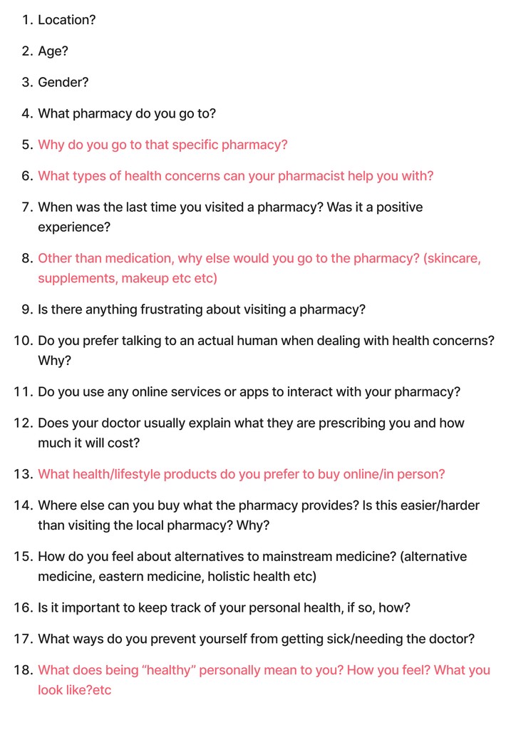 To discover the unique challanges and needs of young people in the pharmacy, we interviewed both college students and pharmacists themselves. Focusing on people aged 18-25, we conducted guerilla style interviews with strangers on the street to figure out their attitudes towards the pharmacy. Talking to pharmacists working in the nearby chemists highlighted the ways in which younger people are not utlisiing the pharmacy services in ways that would benefit them. Why is this happening?