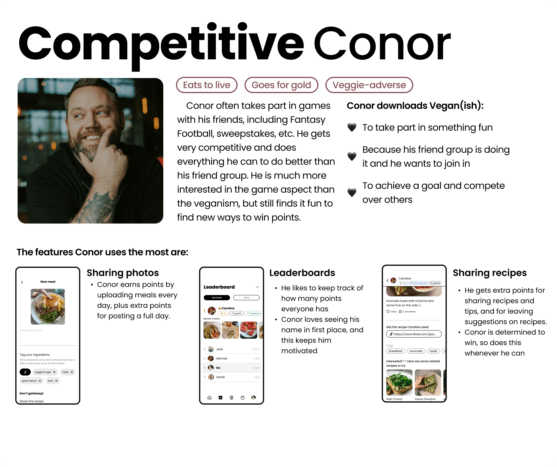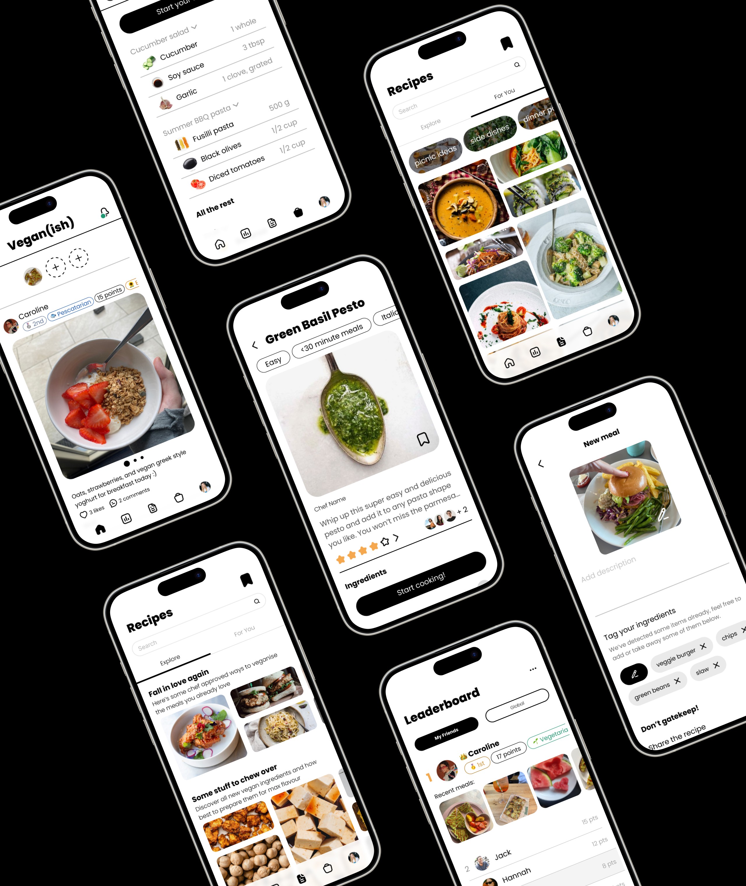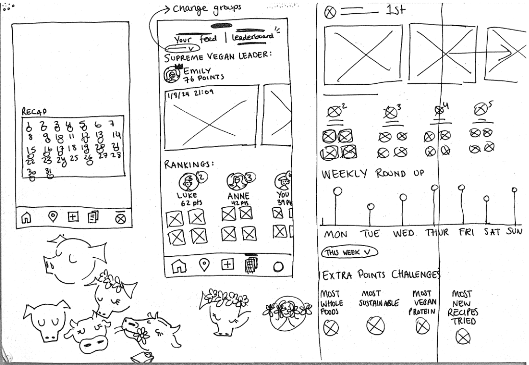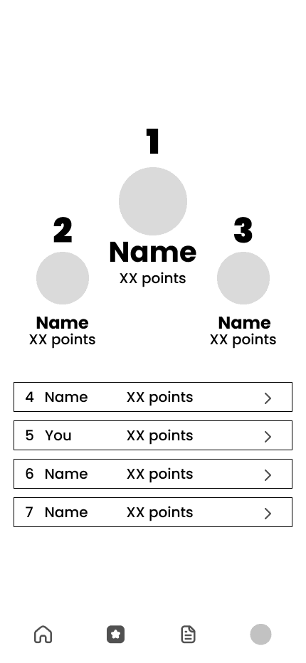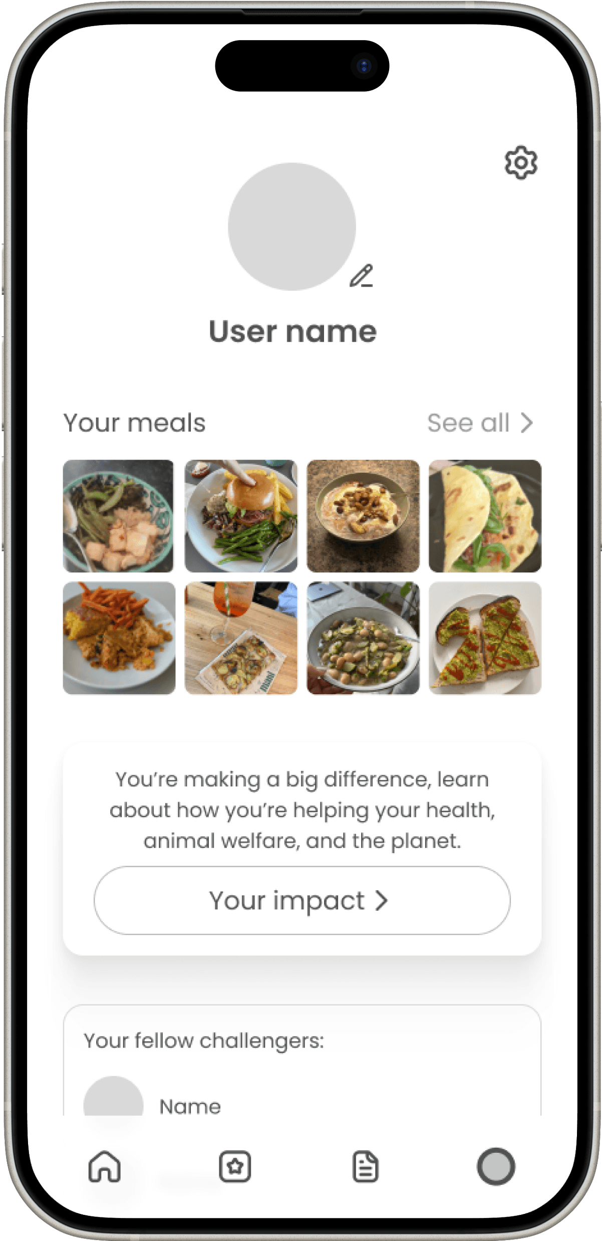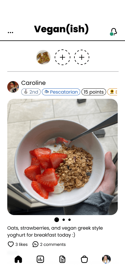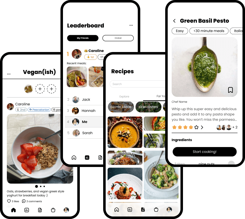 Users earn points for posting meals, sharing recipes, and locating ingredients in stores. Users can also earn extra points depending on what unique challenges they choose during onboarding, to personalise the experience.