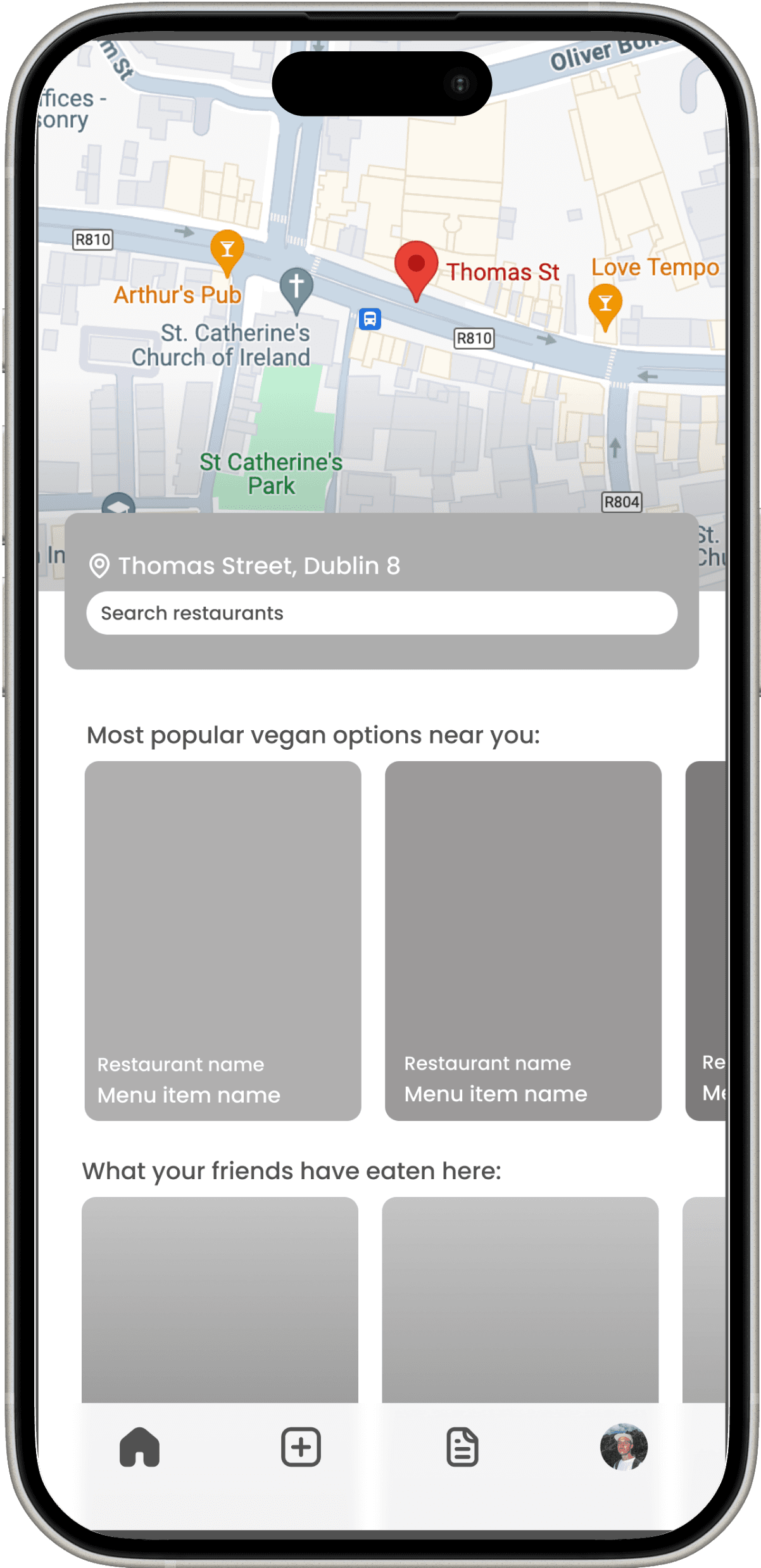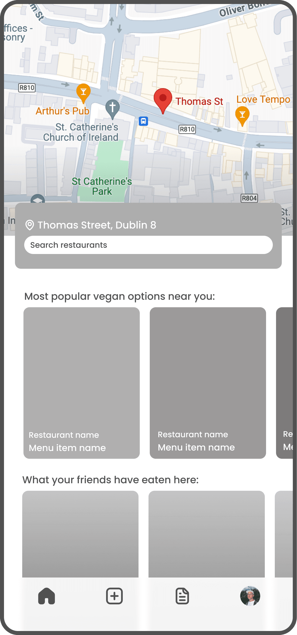Users are first brought to the home screen where they see a timeline of meals posted by friends, as well as reviews of recipes being shared by friends.