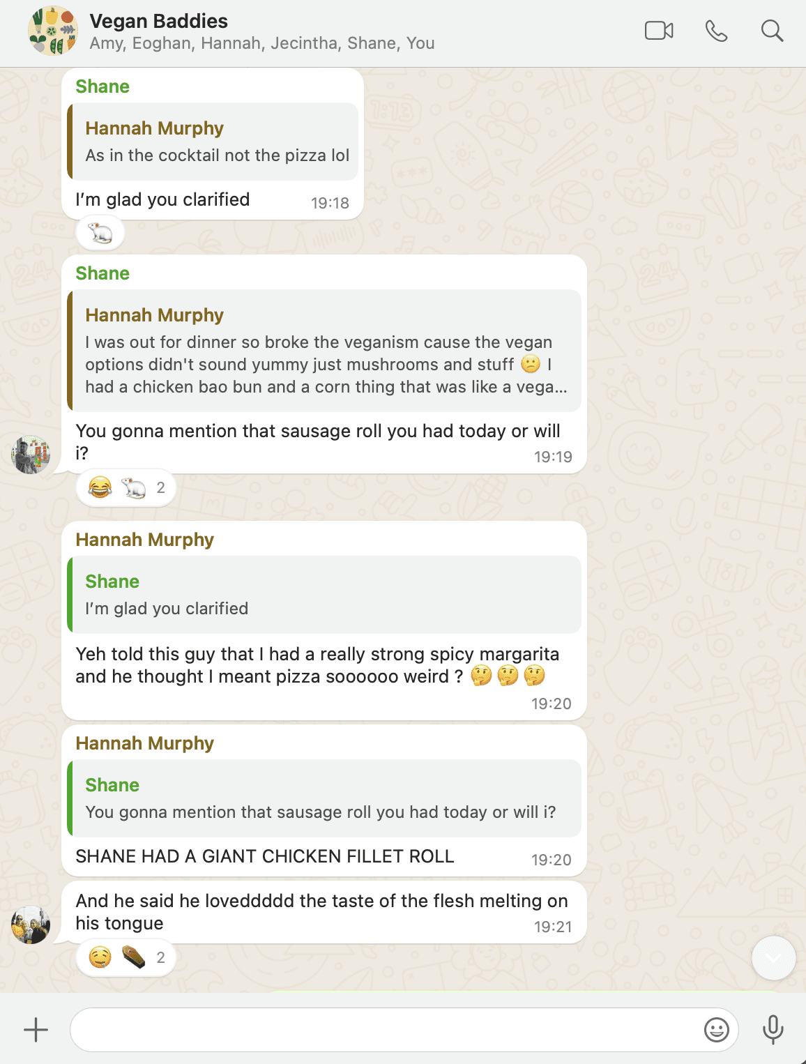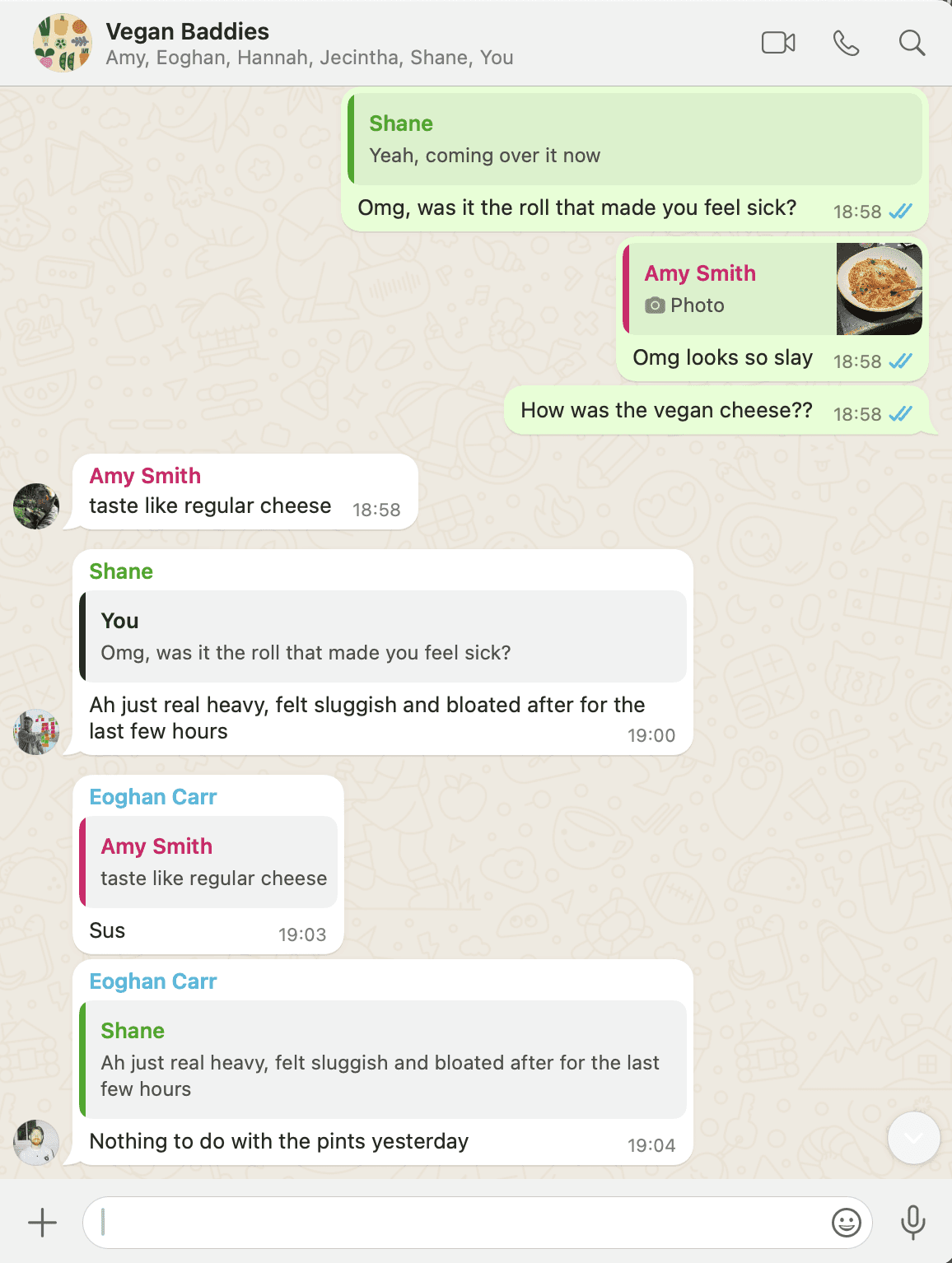 I did this by asking (even more begrudging) friends to stay vegan with me again for another week, but this time to send me photos of every meal they eat. To make things easier, I ended up adding everyone to a group chat to keep all the photos and messages in one space.