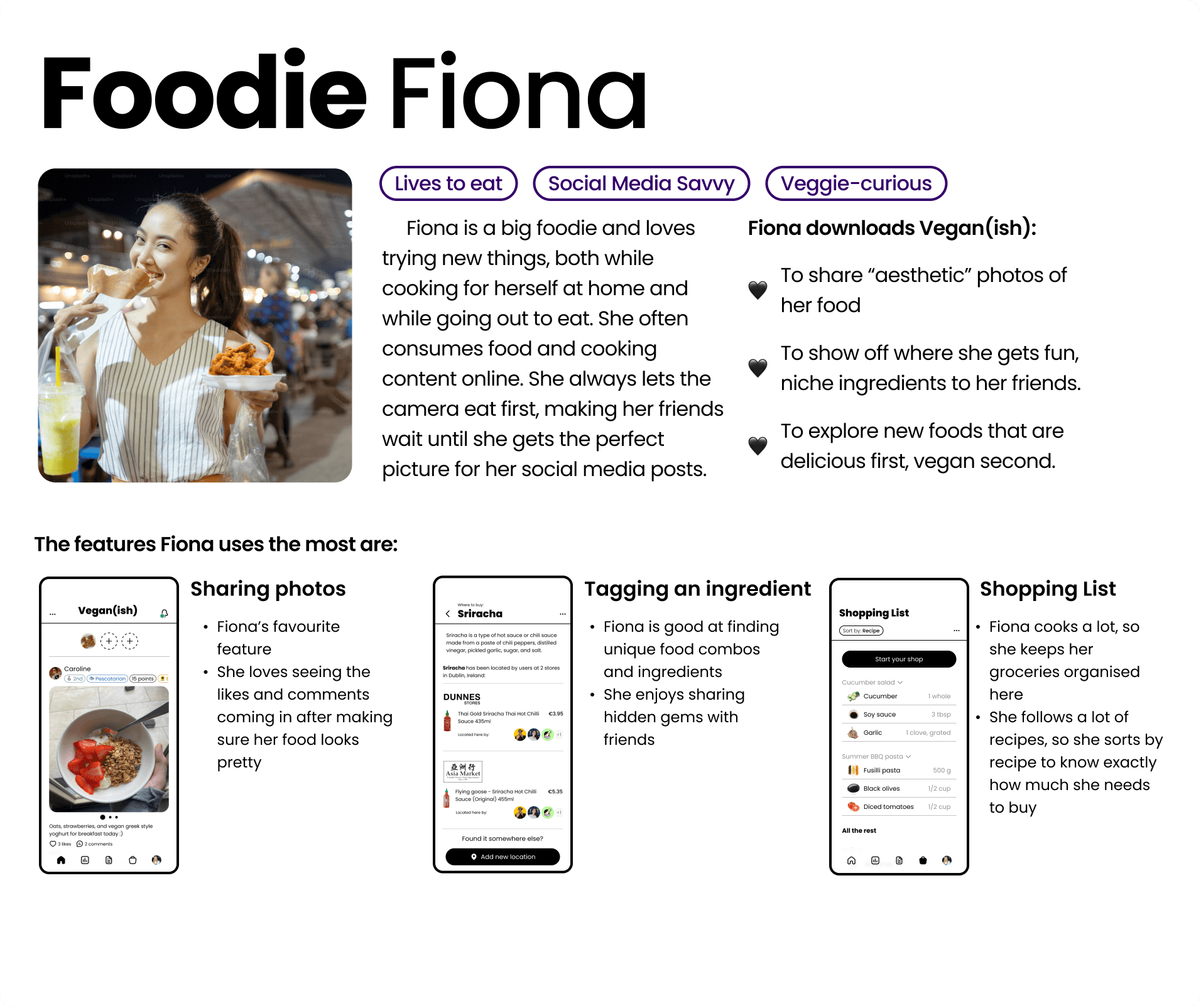 I conducted 8 different interviews, with 3 different groups of people: those who are curious about going plant based, those are really don’t want to go plant based, and those who currently eat plant based. I wanted to learn about their attitudes and hesitations, and to get some advice about how to go vegan successfully. Besides doing academic research, I interviewed people I personally know as this topic of research is so personal and unique to each individual, and so felt a more human centred approach was necessary.