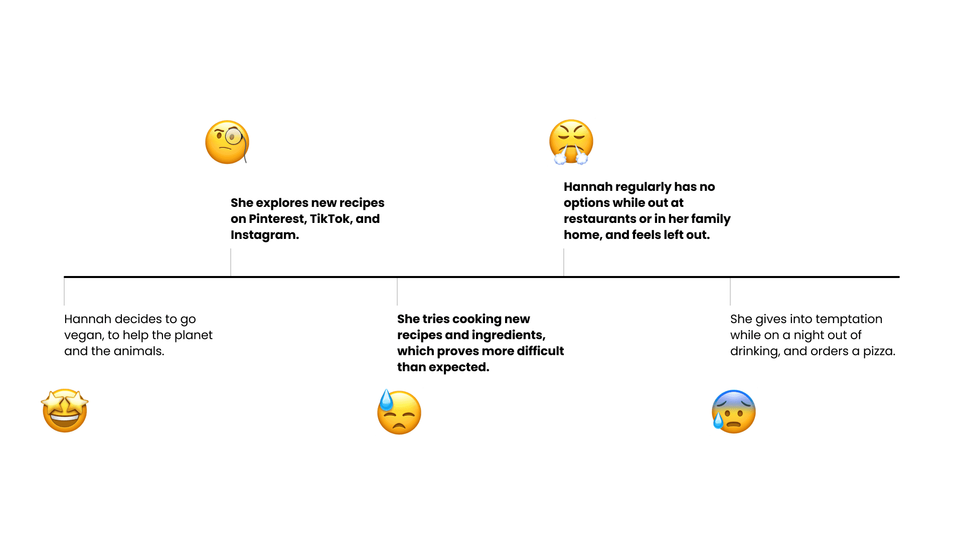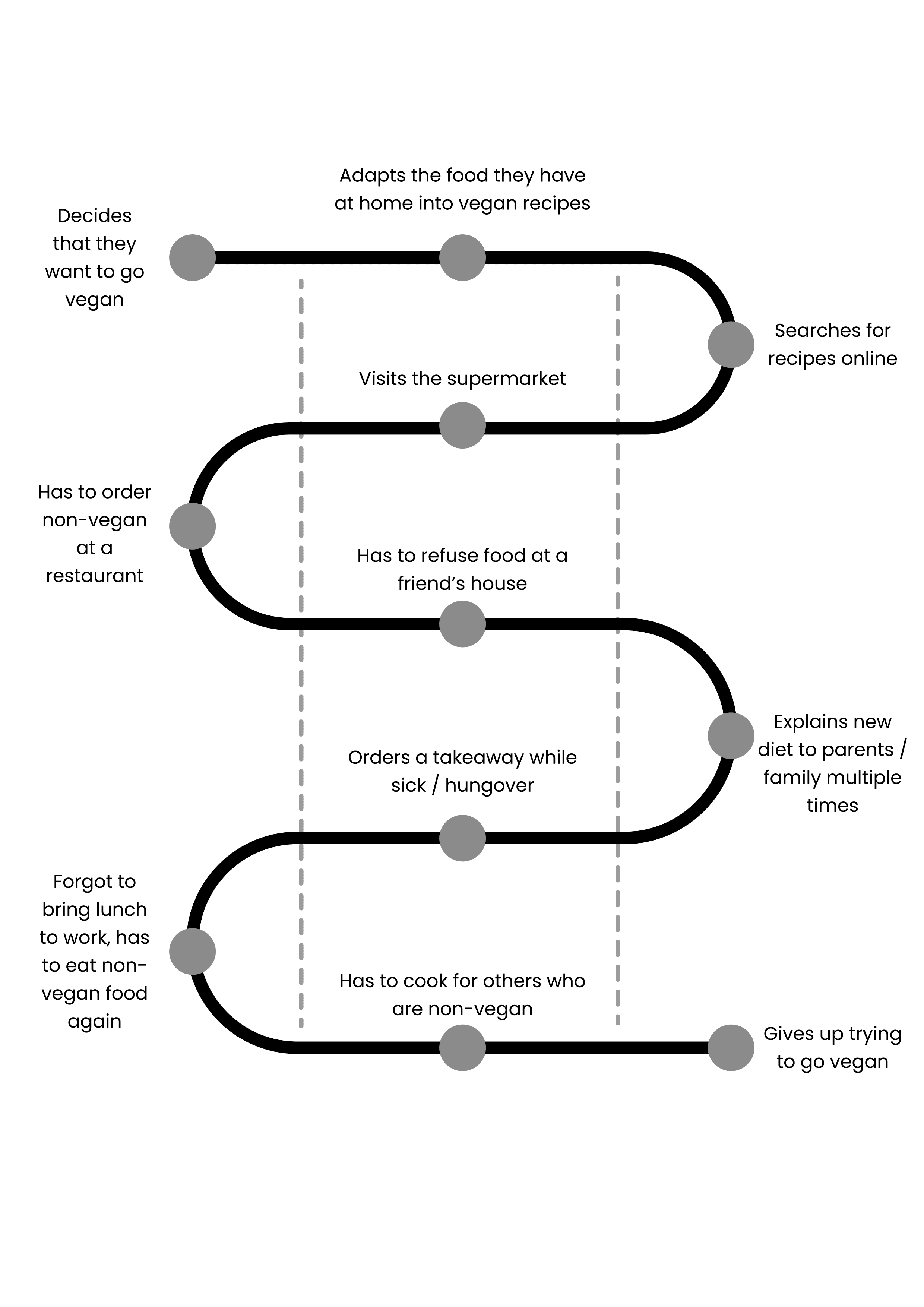 To begin developing early concepts, I created an experience map detailing the user journey when trying to go vegan. Below is a simplified version for easier reading, with my targeted touchpoints in bold.