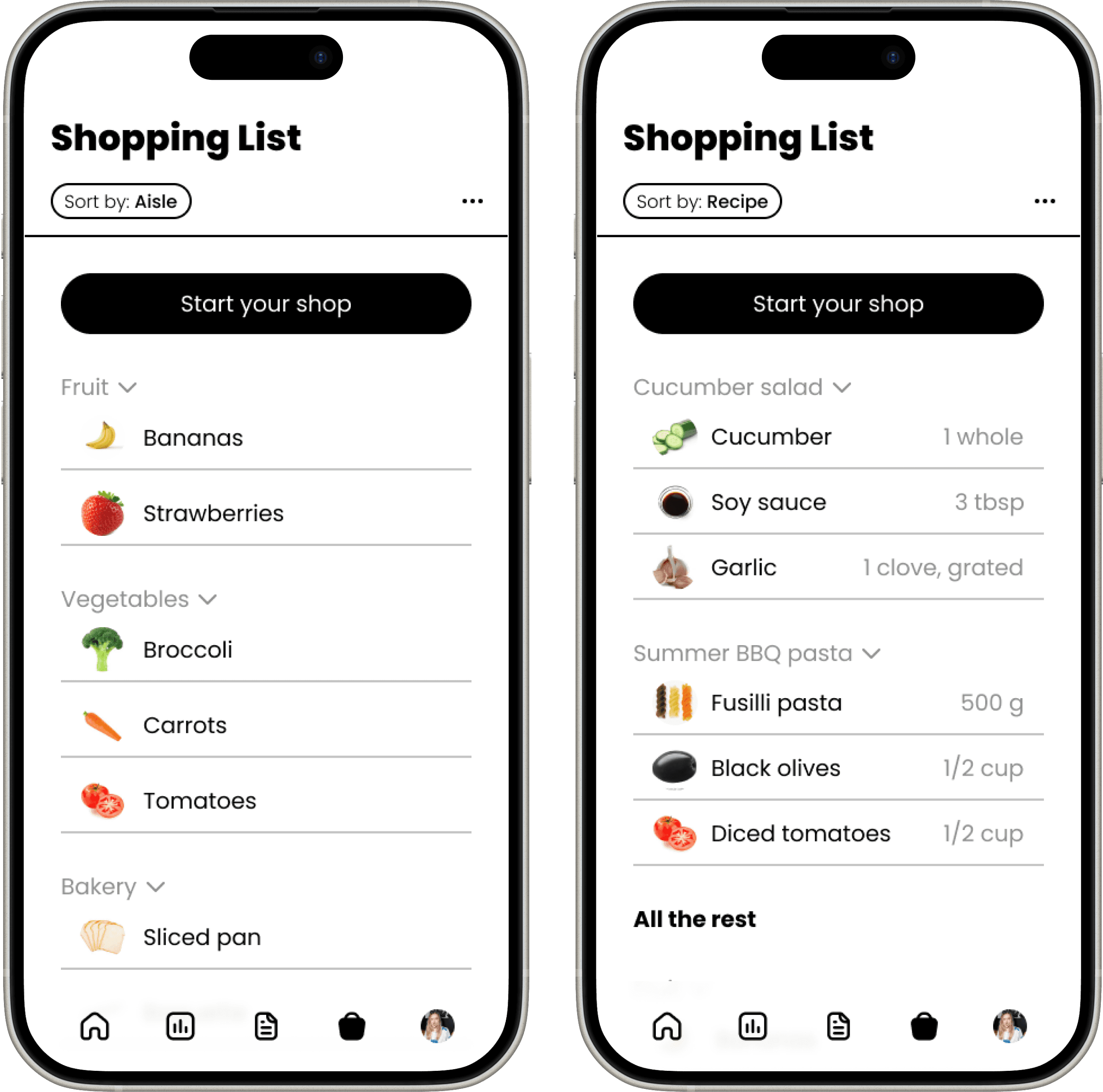 Toggling between Aisle or Recipe modes allows users to organise their list how they like while in store. Aisle mode keeps everything in the correct order to avoid going back and forth between sections in the store. Recipe mode shows the user what each ingredient is needed for, and reminds them of how much they need to get.